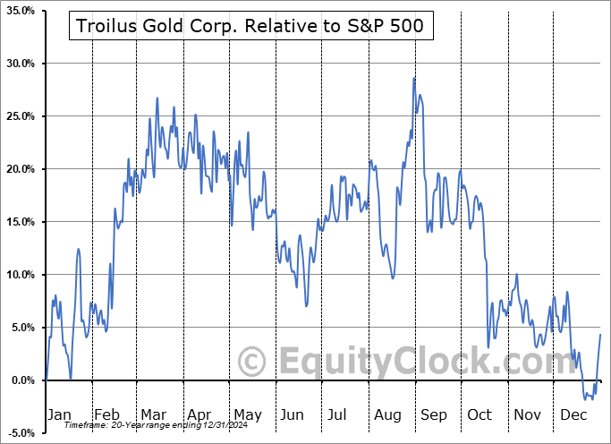 Analysis of the Troilus Gold Corp. (TSE:TLG.TO) seasonal charts above shows that a Buy Date of December 21 and a Sell Date of March 10 has resulted in a geometric average return of 20.59% above the benchmark rate of the S&P 500 Total Return Index over the past 20 years. This seasonal timeframe has shown positive results compared to the benchmark in 16 of those periods. This is a very good rate of success and the return strongly outperforms the relative buy-and-hold performance of the stock over the past 20 years by an average of 57.49% per year.