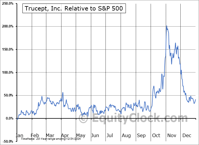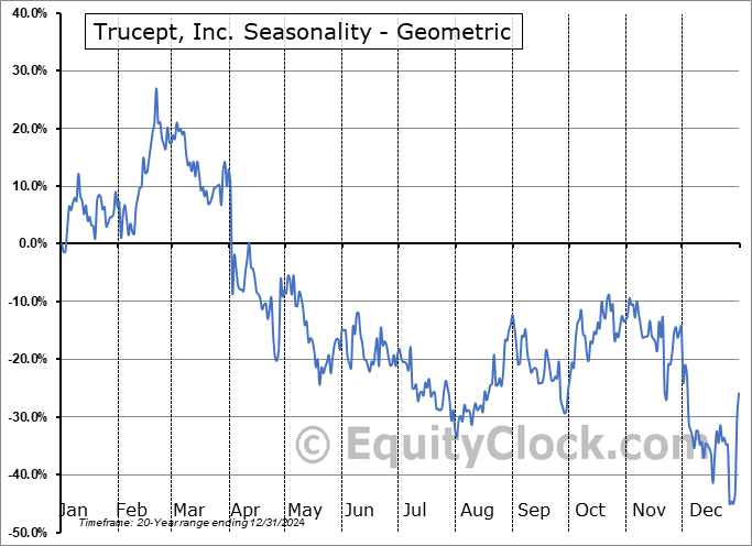 Analysis of the Trucept, Inc. (OTCMKT:TREP) seasonal charts above shows that a Buy Date of July 23 and a Sell Date of November 2 has resulted in a geometric average return of 27.07% above the benchmark rate of the S&P 500 Total Return Index over the past 20 years. This seasonal timeframe has shown positive results compared to the benchmark in 15 of those periods. This is a good rate of success and the return strongly outperforms the relative buy-and-hold performance of the stock over the past 20 years by an average of 60.41% per year.