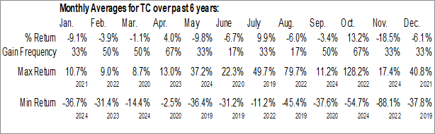 A word of caution: Only 6 years of data is available for shares of TC, perhaps insufficient to create a seasonal profile that accurately gauges the seasonal tendencies influencing the investment. Ideally, while 20 years is preferred, at least 10 years of data is required to perform a seasonal analysis that is considered to be reliable for future seasonal periods.