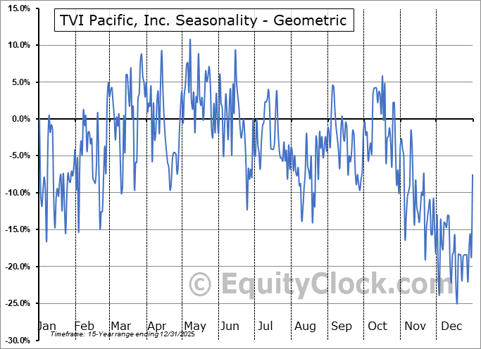 Analysis of the TVI Pacific, Inc. (TSXV:TVI.V) seasonal charts above shows that a Buy Date of December 13 and a Sell Date of March 28 has resulted in a geometric average return of 13.58% above the benchmark rate of the S&P 500 Total Return Index over the past 14 years. This seasonal timeframe has shown positive results compared to the benchmark in 9 of those periods. This is a fair rate of success and the return strongly outperforms the relative buy-and-hold performance of the stock over the past 14 years by an average of 39.86% per year.