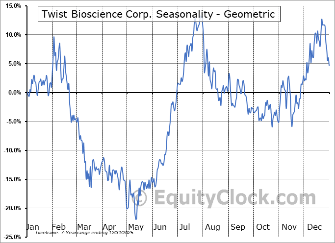 A word of caution: Only 7 years of data is available for shares of TWST, perhaps insufficient to create a seasonal profile that accurately gauges the seasonal tendencies influencing the investment. Ideally, while 20 years is preferred, at least 10 years of data is required to perform a seasonal analysis that is considered to be reliable for future seasonal periods.