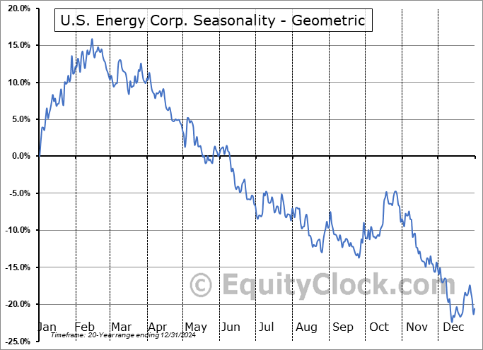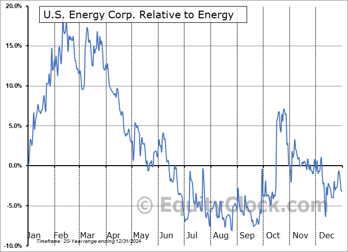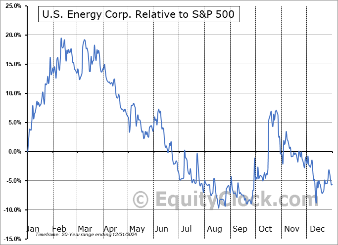 Analysis of the U.S. Energy Corp. (NASD:USEG) seasonal charts above shows that a Buy Date of December 12 and a Sell Date of March 1 has resulted in a geometric average return of 12.09% above the benchmark rate of the S&P 500 Total Return Index over the past 20 years. This seasonal timeframe has shown positive results compared to the benchmark in 15 of those periods. This is a good rate of success and the return strongly outperforms the relative buy-and-hold performance of the stock over the past 20 years by an average of 40.09% per year.