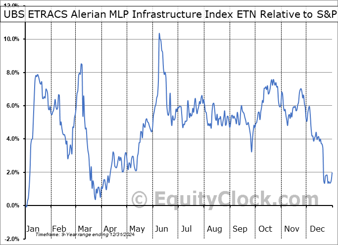 Analysis of the UBS ETRACS Alerian MLP Infrastructure Index ETN (AMEX:MLPB) seasonal charts above shows that a Buy Date of December 21 and a Sell Date of March 10 has resulted in a geometric average return of 2.97% above the benchmark rate of the S&P 500 Total Return Index over the past 9 years. This seasonal timeframe has shown positive results compared to the benchmark in 8 of those periods. This is a very good rate of success and the return strongly outperforms the relative buy-and-hold performance of the stock over the past 9 years by an average of 7.72% per year.