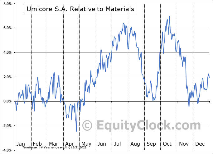 Analysis of the Umicore S.A. (OTCMKT:UMICY) seasonal charts above shows that a Buy Date of February 8 and a Sell Date of May 12 has resulted in a geometric average return of 2.01% above the benchmark rate of the S&P 500 Total Return Index over the past 13 years. This seasonal timeframe has shown positive results compared to the benchmark in 9 of those periods. This is a good rate of success and the return strongly outperforms the relative buy-and-hold performance of the stock over the past 13 years by an average of 18.21% per year.