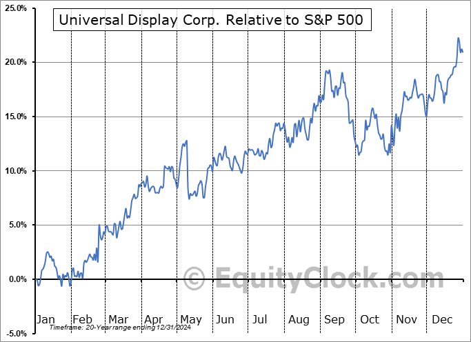 Analysis of the Universal Display Corp. (NASD:OLED) seasonal charts above shows that a Buy Date of May 15 and a Sell Date of September 21 has resulted in a geometric average return of 8.18% above the benchmark rate of the S&P 500 Total Return Index over the past 20 years. This seasonal timeframe has shown positive results compared to the benchmark in 16 of those periods. This is a very good rate of success and the return strongly outperforms the relative buy-and-hold performance of the stock over the past 20 years by an average of 3.35% per year.