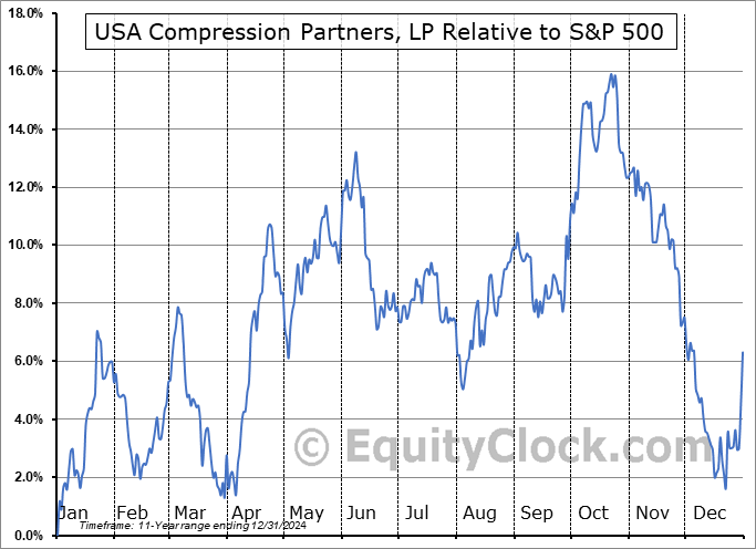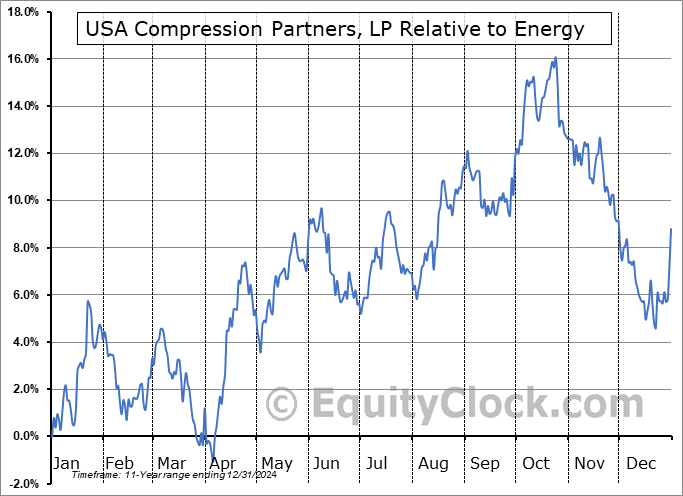 Analysis of the USA Compression Partners, LP (NYSE:USAC) seasonal charts above shows that a Buy Date of December 22 and a Sell Date of April 24 has resulted in a geometric average return of 9.81% above the benchmark rate of the S&P 500 Total Return Index over the past 11 years. This seasonal timeframe has shown positive results compared to the benchmark in 10 of those periods. This is an excellent rate of success and the return strongly outperforms the relative buy-and-hold performance of the stock over the past 11 years by an average of 11.36% per year.