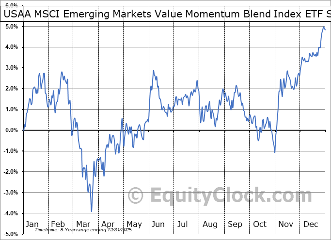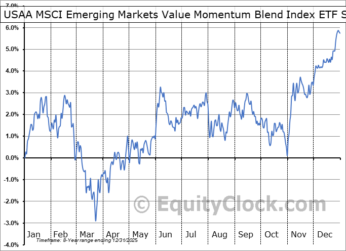 Analysis of the USAA MSCI Emerging Markets Value Momentum Blend Index ETF (NASD:UEVM) seasonal charts above shows that a Buy Date of August 19 and a Sell Date of January 13 has resulted in a geometric average return of 2.61% above the benchmark rate of the S&P 500 Total Return Index over the past 7 years. This seasonal timeframe has shown positive results compared to the benchmark in 5 of those periods. This is a good rate of success and the return strongly outperforms the relative buy-and-hold performance of the stock over the past 7 years by an average of 12.64% per year.