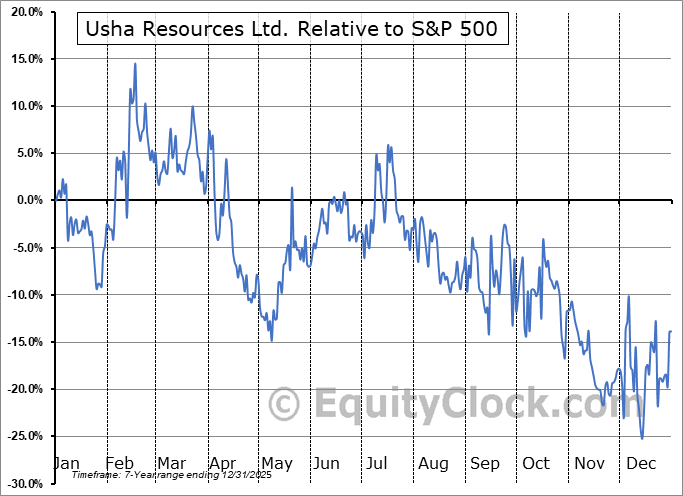 Analysis of the Usha Resources Ltd. (TSXV:USHA.V) seasonal charts above shows that a Buy Date of December 13 and a Sell Date of March 22 has resulted in a geometric average return of 22.64% above the benchmark rate of the S&P 500 Total Return Index over the past 6 years. This seasonal timeframe has shown positive results compared to the benchmark in 5 of those periods. This is a very good rate of success and the return strongly outperforms the relative buy-and-hold performance of the stock over the past 6 years by an average of 52.19% per year.