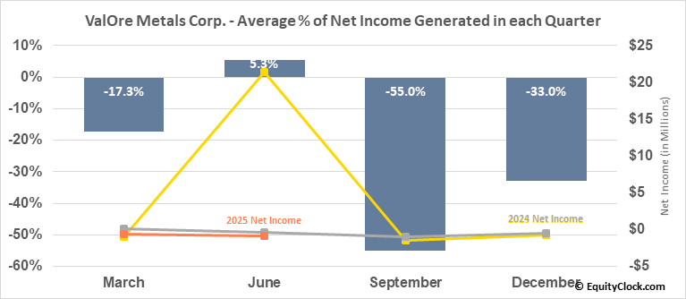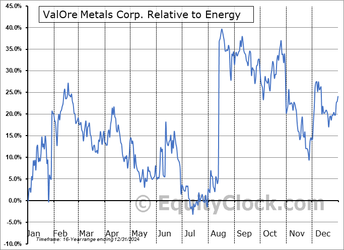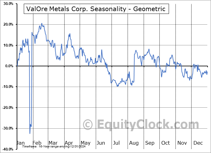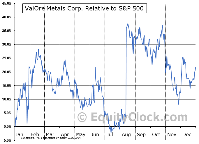 Analysis of the ValOre Metals Corp. (OTCMKT:KVLQF) seasonal charts above shows that a Buy Date of November 30 and a Sell Date of February 21 has resulted in a geometric average return of 24.01% above the benchmark rate of the S&P 500 Total Return Index over the past 16 years. This seasonal timeframe has shown positive results compared to the benchmark in 12 of those periods. This is a good rate of success and the return strongly outperforms the relative buy-and-hold performance of the stock over the past 16 years by an average of 38.97% per year.