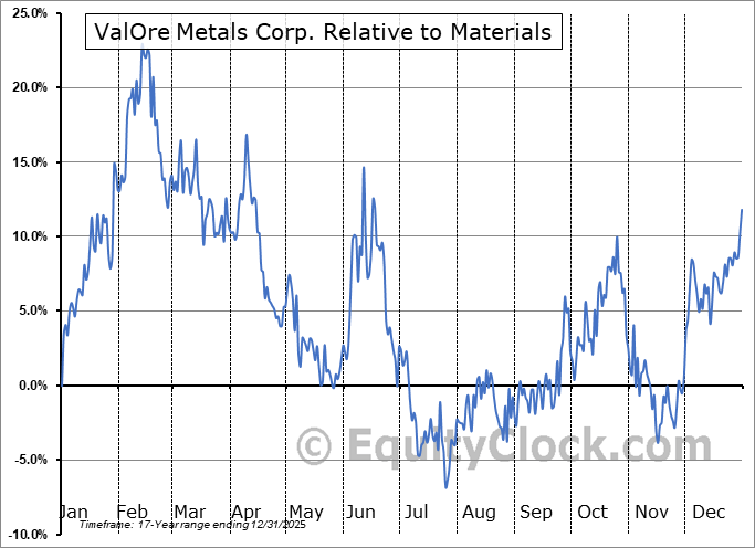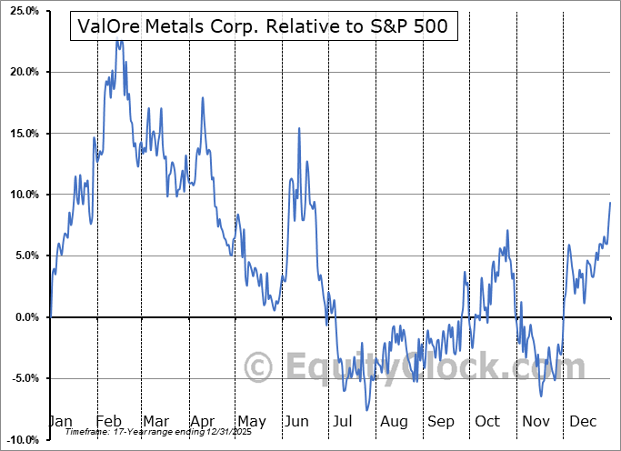 Analysis of the ValOre Metals Corp. (TSXV:VO.V) seasonal charts above shows that a Buy Date of November 28 and a Sell Date of February 21 has resulted in a geometric average return of 16.52% above the benchmark rate of the S&P 500 Total Return Index over the past 16 years. This seasonal timeframe has shown positive results compared to the benchmark in 12 of those periods. This is a good rate of success and the return strongly outperforms the relative buy-and-hold performance of the stock over the past 16 years by an average of 42.99% per year.