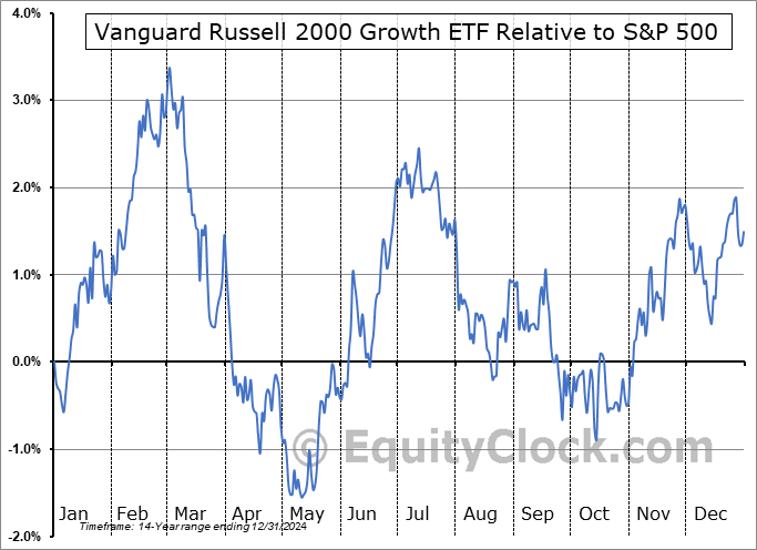 Analysis of the Vanguard Russell 2000 Growth ETF (NASD:VTWG) seasonal charts above shows that a Buy Date of November 9 and a Sell Date of February 27 has resulted in a geometric average return of 1.85% above the benchmark rate of the S&P 500 Total Return Index over the past 14 years. This seasonal timeframe has shown positive results compared to the benchmark in 12 of those periods. This is a very good rate of success and the return strongly outperforms the relative buy-and-hold performance of the stock over the past 14 years by an average of 5.29% per year.