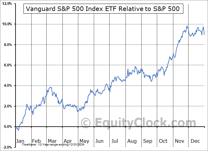 Analysis of the Vanguard S&P 500 Index ETF (TSE:VFV.TO) seasonal charts above shows that a Buy Date of September 4 and a Sell Date of November 23 has resulted in a geometric average return of 1.59% above the benchmark rate of the S&P 500 Total Return Index over the past 12 years. This seasonal timeframe has shown positive results compared to the benchmark in 12 of those periods. This is an excellent rate of success, but the return underperforms the relative buy-and-hold performance of the stock over the past 12 years by an average of 1.34% per year.