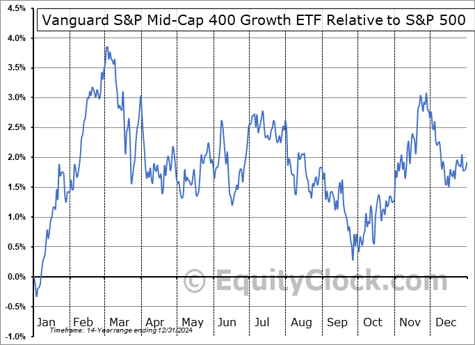 Analysis of the Vanguard S&P Mid-Cap 400 Growth ETF (NYSE:IVOG) seasonal charts above shows that a Buy Date of October 23 and a Sell Date of March 7 has resulted in a geometric average return of 1.42% above the benchmark rate of the S&P 500 Total Return Index over the past 14 years. This seasonal timeframe has shown positive results compared to the benchmark in 11 of those periods. This is a good rate of success and the return strongly outperforms the relative buy-and-hold performance of the stock over the past 14 years by an average of 4% per year.