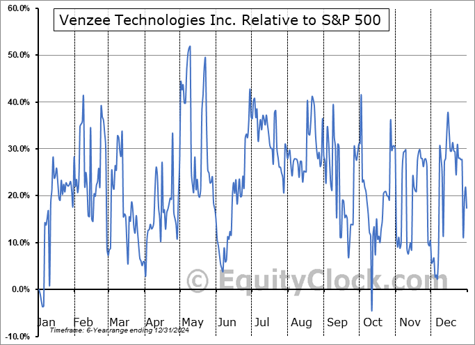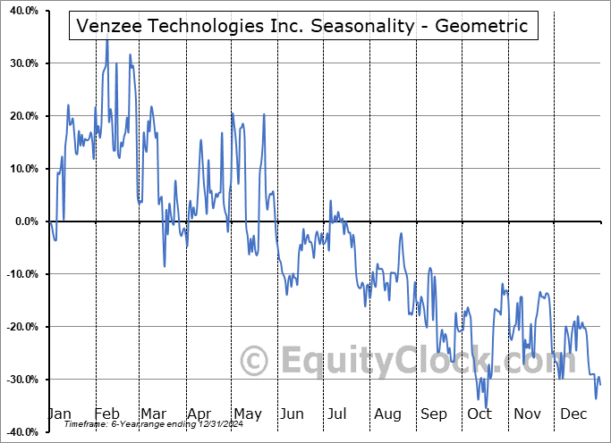 Analysis of the Venzee Technologies Inc. (TSXV:VENZ.V) seasonal charts above shows that a Buy Date of December 4 and a Sell Date of February 24 has resulted in a geometric average return of 38.33% above the benchmark rate of the S&P 500 Total Return Index over the past 6 years. This seasonal timeframe has shown positive results compared to the benchmark in 6 of those periods. This is an excellent rate of success and the return strongly outperforms the relative buy-and-hold performance of the stock over the past 6 years by an average of 78.17% per year.