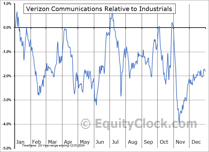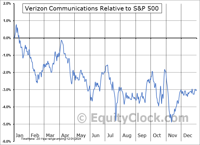 Analysis of the Verizon Communications (NYSE:VZ) seasonal charts above shows that a Buy Date of July 22 and a Sell Date of October 30 has resulted in a geometric average return of 2.35% above the benchmark rate of the S&P 500 Total Return Index over the past 20 years. This seasonal timeframe has shown positive results compared to the benchmark in 12 of those periods. This is a fair rate of success and the return strongly outperforms the relative buy-and-hold performance of the stock over the past 20 years by an average of 6.59% per year.