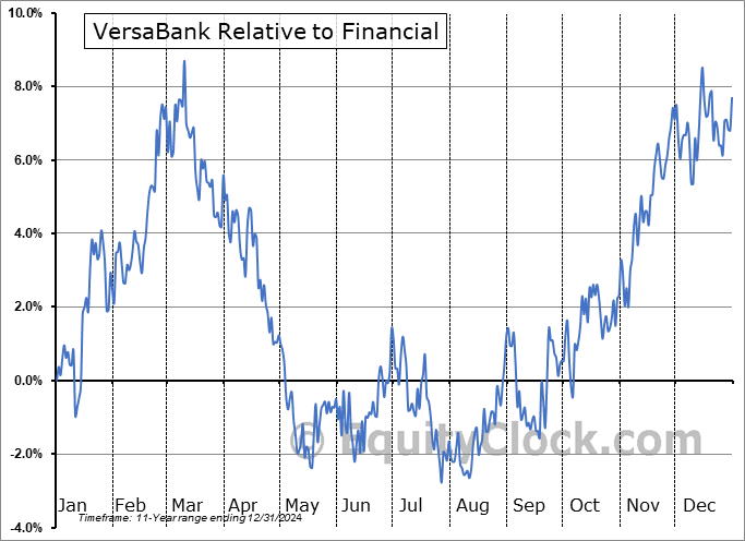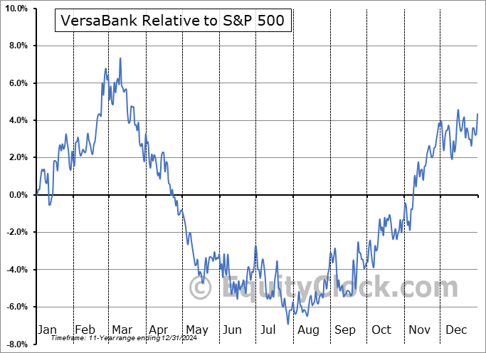 Analysis of the VersaBank (TSE:VBNK.TO) seasonal charts above shows that a Buy Date of August 21 and a Sell Date of January 7 has resulted in a geometric average return of 9.9% above the benchmark rate of the S&P 500 Total Return Index over the past 11 years. This seasonal timeframe has shown positive results compared to the benchmark in 9 of those periods. This is a very good rate of success and the return strongly outperforms the relative buy-and-hold performance of the stock over the past 11 years by an average of 12.01% per year.