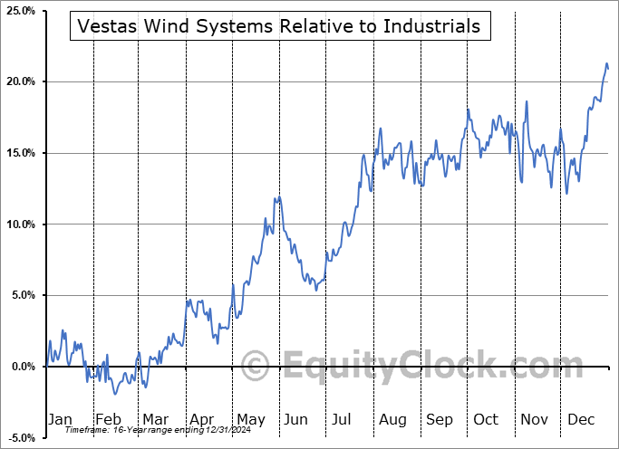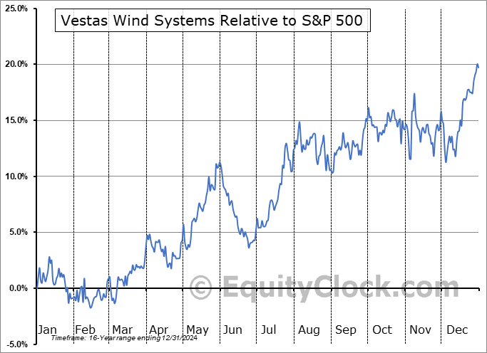 Analysis of the Vestas Wind Systems (OTCMKT:VWSYF) seasonal charts above shows that a Buy Date of November 24 and a Sell Date of March 1 has resulted in a geometric average return of 5.03% above the benchmark rate of the S&P 500 Total Return Index over the past 16 years. This seasonal timeframe has shown positive results compared to the benchmark in 13 of those periods. This is a very good rate of success and the return strongly outperforms the relative buy-and-hold performance of the stock over the past 16 years by an average of 17.05% per year.
