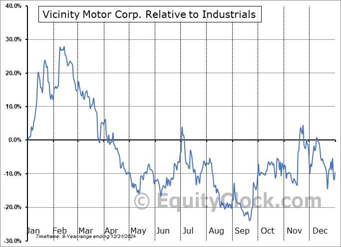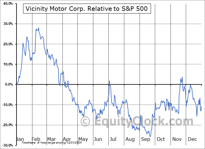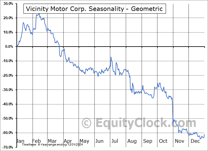 Analysis of the Vicinity Motor Corp. (OTCMKT:VEVMQ) seasonal charts above shows that a Buy Date of December 1 and a Sell Date of February 21 has resulted in a geometric average return of 15.19% above the benchmark rate of the S&P 500 Total Return Index over the past 8 years. This seasonal timeframe has shown positive results compared to the benchmark in 6 of those periods. This is a good rate of success and the return strongly outperforms the relative buy-and-hold performance of the stock over the past 8 years by an average of 80.71% per year.