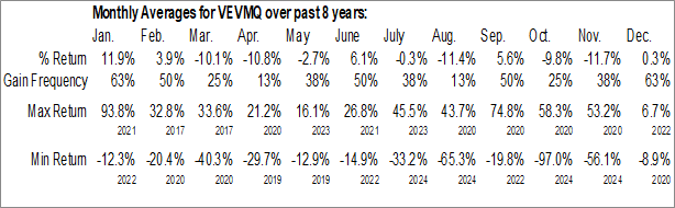 A word of caution: Only 8 years of data is available for shares of VEVMQ, perhaps insufficient to create a seasonal profile that accurately gauges the seasonal tendencies influencing the investment. Ideally, while 20 years is preferred, at least 10 years of data is required to perform a seasonal analysis that is considered to be reliable for future seasonal periods.