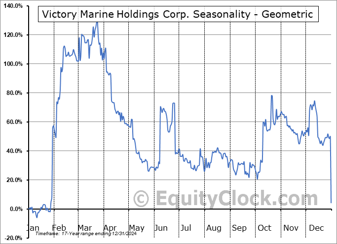 Analysis of the Victory Marine Holdings Corp. (OTCMKT:VMHG) seasonal charts above shows that a Buy Date of July 21 and a Sell Date of November 2 has resulted in a geometric average return of 30.74% above the benchmark rate of the S&P 500 Total Return Index over the past 17 years. This seasonal timeframe has shown positive results compared to the benchmark in 11 of those periods. This is a fair rate of success and the return strongly outperforms the relative buy-and-hold performance of the stock over the past 17 years by an average of 36.74% per year.