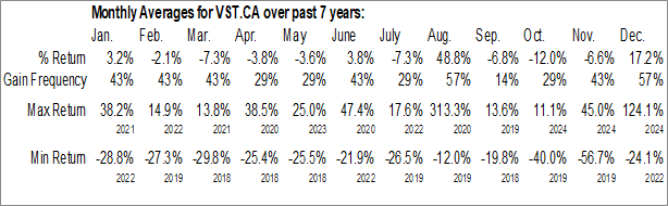 A word of caution: Only 7 years of data is available for shares of VST.CA, perhaps insufficient to create a seasonal profile that accurately gauges the seasonal tendencies influencing the investment. Ideally, while 20 years is preferred, at least 10 years of data is required to perform a seasonal analysis that is considered to be reliable for future seasonal periods.