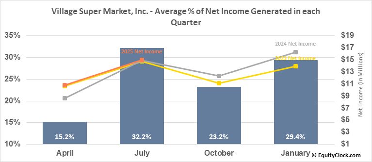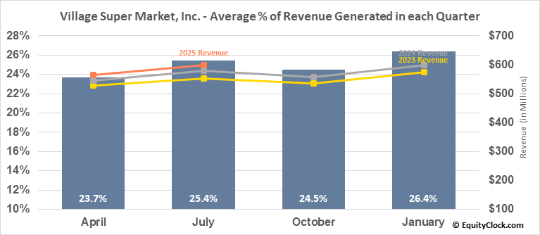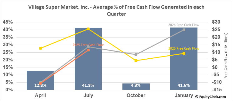 Village Super Market, Inc. (NASD:VLGEA) Seasonal Chart