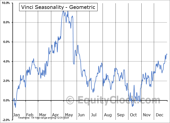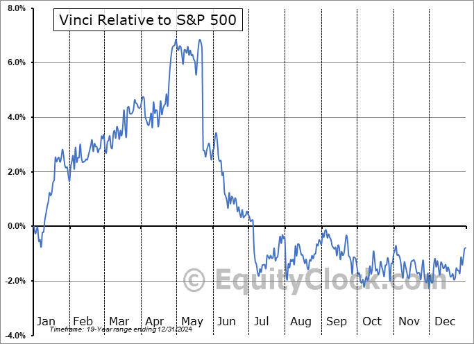 Analysis of the Vinci (OTCMKT:VCISY) seasonal charts above shows that a Buy Date of October 9 and a Sell Date of February 21 has resulted in a geometric average return of 3.86% above the benchmark rate of the S&P 500 Total Return Index over the past 19 years. This seasonal timeframe has shown positive results compared to the benchmark in 15 of those periods. This is a good rate of success and the return strongly outperforms the relative buy-and-hold performance of the stock over the past 19 years by an average of 9.16% per year.