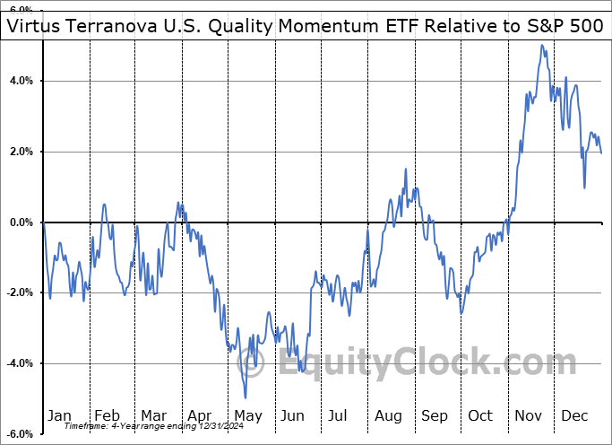Analysis of the Virtus Terranova U.S. Quality Momentum ETF (AMEX:JOET) seasonal charts above shows that a Buy Date of July 19 and a Sell Date of December 14 has resulted in a geometric average return of 2.75% above the benchmark rate of the S&P 500 Total Return Index over the past 4 years. This seasonal timeframe has shown positive results compared to the benchmark in 4 of those periods. This is an excellent rate of success and the return strongly outperforms the relative buy-and-hold performance of the stock over the past 4 years by an average of 5.75% per year.