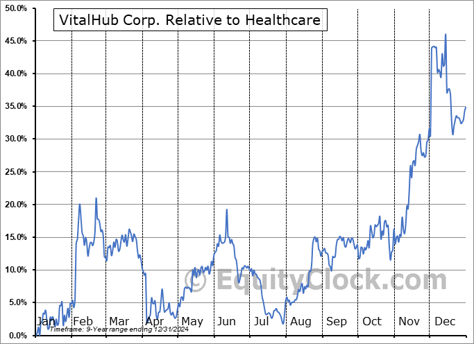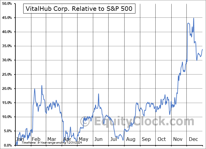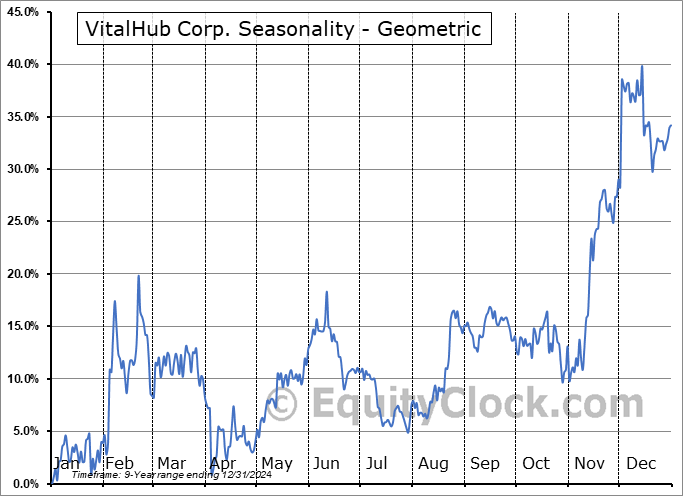 Analysis of the VitalHub Corp. (TSE:VHI.TO) seasonal charts above shows that a Buy Date of October 10 and a Sell Date of February 21 has resulted in a geometric average return of 27.68% above the benchmark rate of the S&P 500 Total Return Index over the past 9 years. This seasonal timeframe has shown positive results compared to the benchmark in 9 of those periods. This is an excellent rate of success and the return strongly outperforms the relative buy-and-hold performance of the stock over the past 9 years by an average of 10.57% per year.
