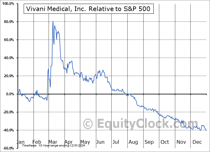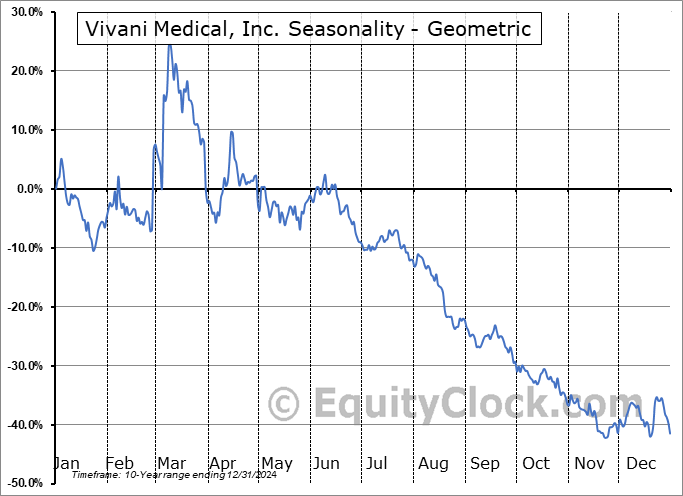 Analysis of the Vivani Medical, Inc. (NASD:VANI) seasonal charts above shows that a Buy Date of January 23 and a Sell Date of April 15 has resulted in a geometric average return of 19.97% above the benchmark rate of the S&P 500 Total Return Index over the past 10 years. This seasonal timeframe has shown positive results compared to the benchmark in 7 of those periods. This is a good rate of success and the return strongly outperforms the relative buy-and-hold performance of the stock over the past 10 years by an average of 68.14% per year.