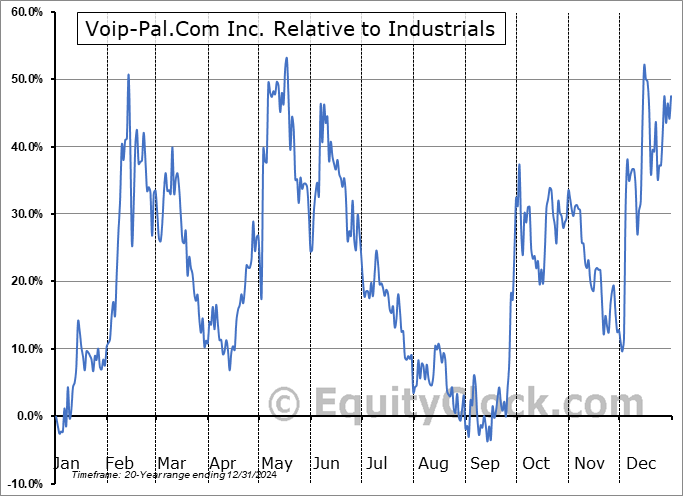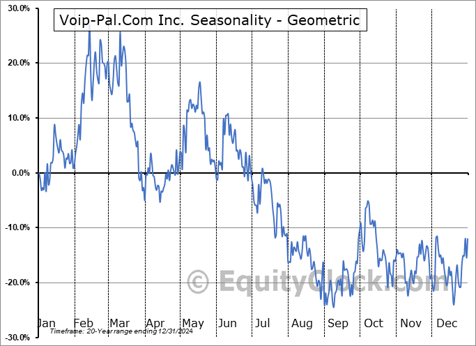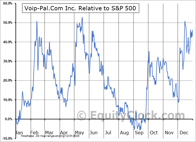 Analysis of the Voip-Pal.Com Inc. (OTCMKT:VPLM) seasonal charts above shows that a Buy Date of December 20 and a Sell Date of March 10 has resulted in a geometric average return of 41.03% above the benchmark rate of the S&P 500 Total Return Index over the past 20 years. This seasonal timeframe has shown positive results compared to the benchmark in 14 of those periods. This is a good rate of success and the return strongly outperforms the relative buy-and-hold performance of the stock over the past 20 years by an average of 61.72% per year.