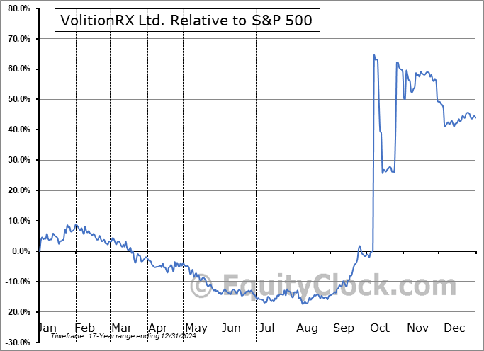 Analysis of the VolitionRX Ltd. (AMEX:VNRX) seasonal charts above shows that a Buy Date of August 12 and a Sell Date of November 20 has resulted in a geometric average return of 28.2% above the benchmark rate of the S&P 500 Total Return Index over the past 17 years. This seasonal timeframe has shown positive results compared to the benchmark in 12 of those periods. This is a good rate of success and the return strongly outperforms the relative buy-and-hold performance of the stock over the past 17 years by an average of 35.78% per year.