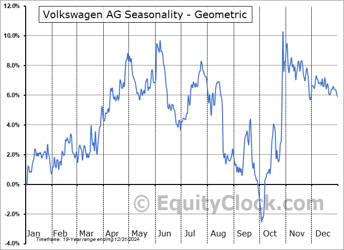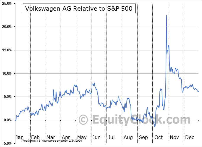 Analysis of the Volkswagen AG (OTCMKT:VLKAF) seasonal charts above shows that a Buy Date of October 5 and a Sell Date of January 22 has resulted in a geometric average return of 6.93% above the benchmark rate of the S&P 500 Total Return Index over the past 19 years. This seasonal timeframe has shown positive results compared to the benchmark in 15 of those periods. This is a good rate of success and the return strongly outperforms the relative buy-and-hold performance of the stock over the past 19 years by an average of 10.97% per year.