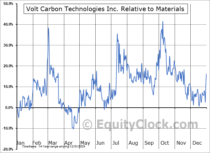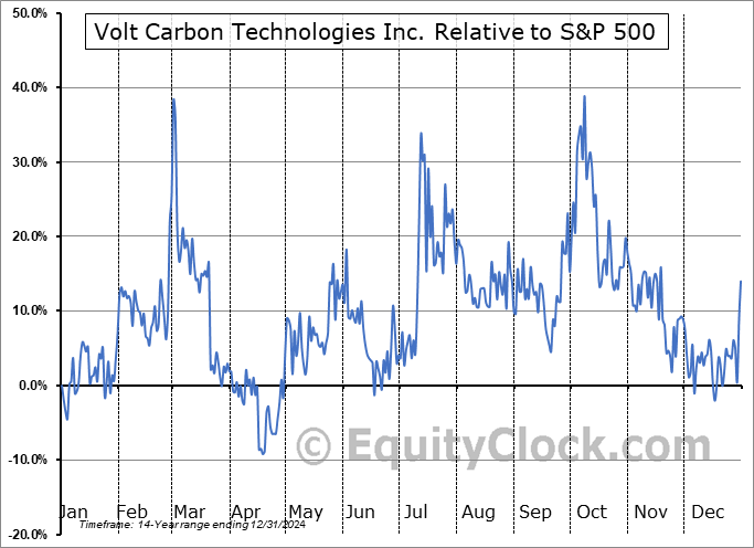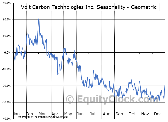 Analysis of the Volt Carbon Technologies Inc. (TSXV:VCT.V) seasonal charts above shows that a Buy Date of December 9 and a Sell Date of March 1 has resulted in a geometric average return of 30.37% above the benchmark rate of the S&P 500 Total Return Index over the past 14 years. This seasonal timeframe has shown positive results compared to the benchmark in 11 of those periods. This is a good rate of success and the return strongly outperforms the relative buy-and-hold performance of the stock over the past 14 years by an average of 59.93% per year.