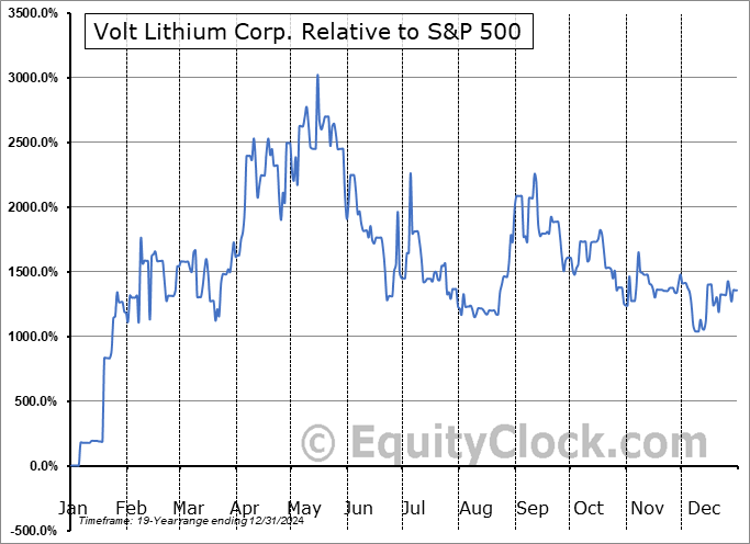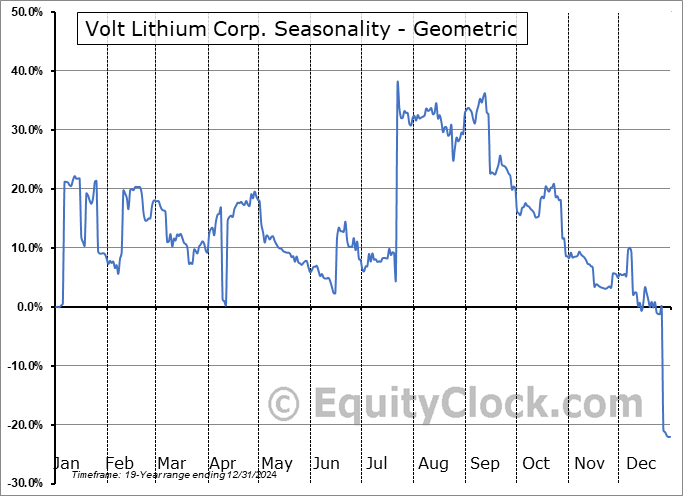 Analysis of the Volt Lithium Corp. (OTCMKT:VLTLF) seasonal charts above shows that a Buy Date of March 20 and a Sell Date of August 4 has resulted in a geometric average return of 16.12% above the benchmark rate of the S&P 500 Total Return Index over the past 19 years. This seasonal timeframe has shown positive results compared to the benchmark in 9 of those periods. This is a poor rate of success and the return strongly outperforms the relative buy-and-hold performance of the stock over the past 19 years by an average of 45.36% per year.