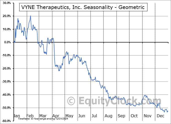 A word of caution: Only 6 years of data is available for shares of VYNE, perhaps insufficient to create a seasonal profile that accurately gauges the seasonal tendencies influencing the investment. Ideally, while 20 years is preferred, at least 10 years of data is required to perform a seasonal analysis that is considered to be reliable for future seasonal periods.