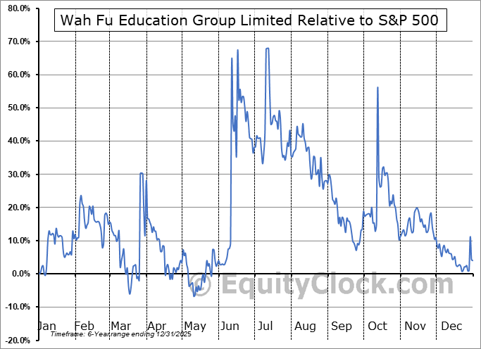 Analysis of the Wah Fu Education Group Limited (NASD:WAFU) seasonal charts above shows that a Buy Date of April 16 and a Sell Date of July 11 has resulted in a geometric average return of 36.92% above the benchmark rate of the S&P 500 Total Return Index over the past 5 years. This seasonal timeframe has shown positive results compared to the benchmark in 4 of those periods. This is a very good rate of success and the return strongly outperforms the relative buy-and-hold performance of the stock over the past 5 years by an average of 48.99% per year.