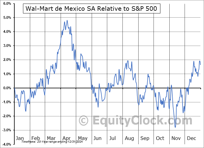 Analysis of the Wal-Mart de Mexico SA (OTCMKT:WMMVY) seasonal charts above shows that a Buy Date of November 12 and a Sell Date of March 19 has resulted in a geometric average return of 3.51% above the benchmark rate of the S&P 500 Total Return Index over the past 20 years. This seasonal timeframe has shown positive results compared to the benchmark in 15 of those periods. This is a good rate of success and the return strongly outperforms the relative buy-and-hold performance of the stock over the past 20 years by an average of 6.02% per year.