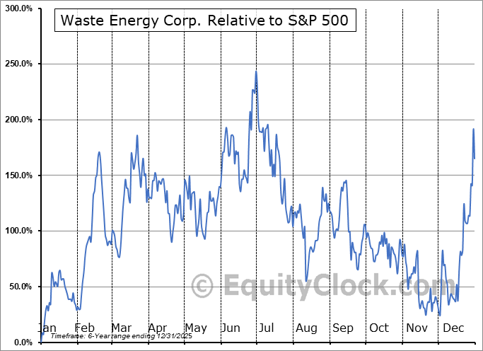 Analysis of the Waste Energy Corp. (OTCMKT:WAST) seasonal charts above shows that a Buy Date of November 25 and a Sell Date of February 15 has resulted in a geometric average return of 147.3% above the benchmark rate of the S&P 500 Total Return Index over the past 5 years. This seasonal timeframe has shown positive results compared to the benchmark in 5 of those periods. This is an excellent rate of success and the return strongly outperforms the relative buy-and-hold performance of the stock over the past 5 years by an average of 214.49% per year.