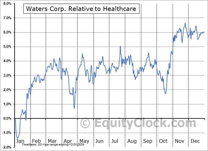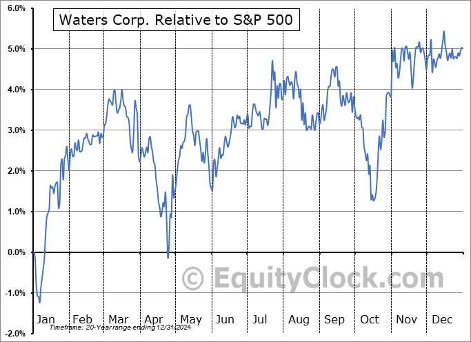 Analysis of the Waters Corp. (NYSE:WAT) seasonal charts above shows that a Buy Date of October 15 and a Sell Date of February 24 has resulted in a geometric average return of 4.53% above the benchmark rate of the S&P 500 Total Return Index over the past 20 years. This seasonal timeframe has shown positive results compared to the benchmark in 17 of those periods. This is a very good rate of success and the return strongly outperforms the relative buy-and-hold performance of the stock over the past 20 years by an average of 3.93% per year.