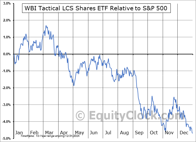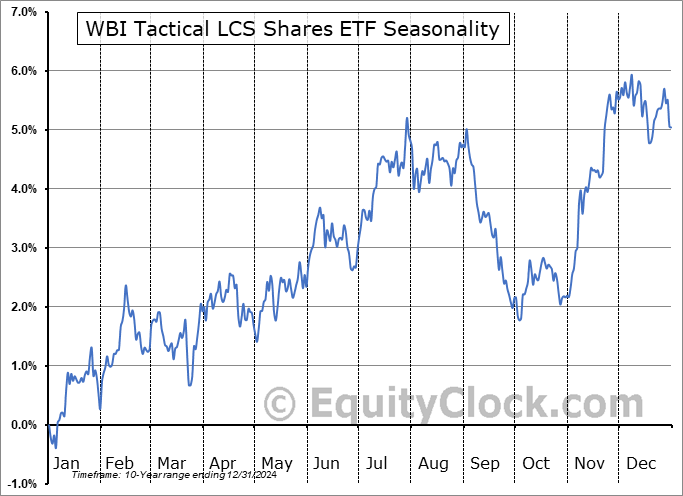 Analysis of the WBI Tactical LCS Shares ETF (AMEX:WBIL) seasonal charts above shows that a Buy Date of January 2 and a Sell Date of March 22 has resulted in a geometric average return of 1.56% above the benchmark rate of the S&P 500 Total Return Index over the past 10 years. This seasonal timeframe has shown positive results compared to the benchmark in 5 of those periods. This is a poor rate of success and the return strongly outperforms the relative buy-and-hold performance of the stock over the past 10 years by an average of 9.08% per year.