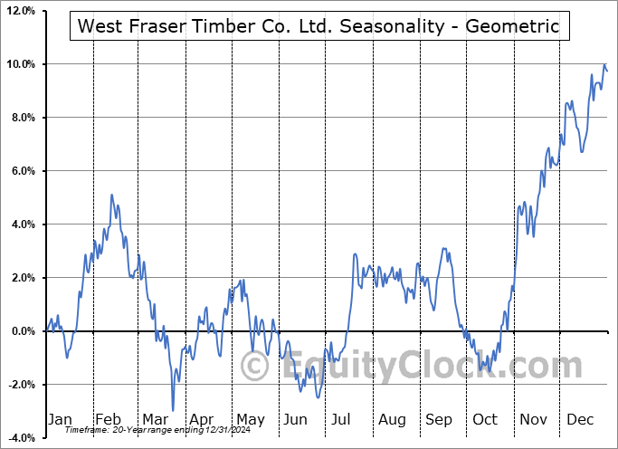 Analysis of the West Fraser Timber Co. Ltd. (TSE:WFG.TO) seasonal charts above shows that a Buy Date of October 6 and a Sell Date of February 15 has resulted in a geometric average return of 8.97% above the benchmark rate of the S&P 500 Total Return Index over the past 20 years. This seasonal timeframe has shown positive results compared to the benchmark in 18 of those periods. This is an excellent rate of success and the return strongly outperforms the relative buy-and-hold performance of the stock over the past 20 years by an average of 9.37% per year.