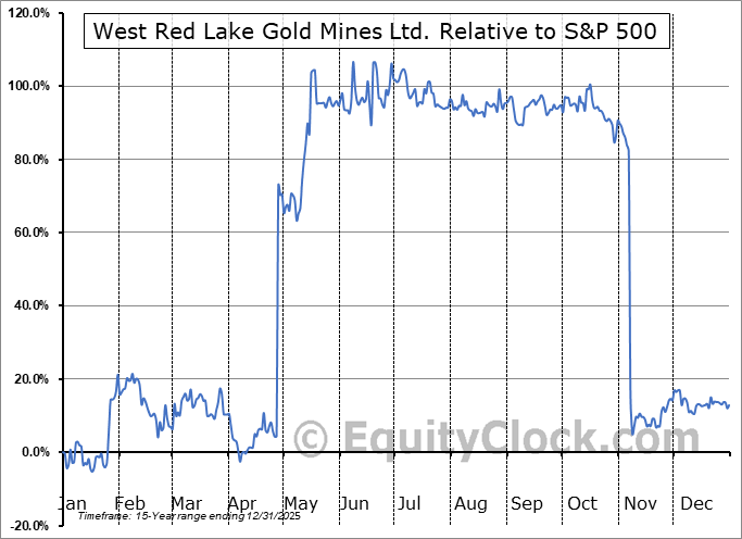 Analysis of the West Red Lake Gold Mines Ltd. (TSXV:WRLG.V) seasonal charts above shows that a Buy Date of November 24 and a Sell Date of March 28 has resulted in a geometric average return of 19.48% above the benchmark rate of the S&P 500 Total Return Index over the past 14 years. This seasonal timeframe has shown positive results compared to the benchmark in 10 of those periods. This is a good rate of success and the return strongly outperforms the relative buy-and-hold performance of the stock over the past 14 years by an average of 36.9% per year.