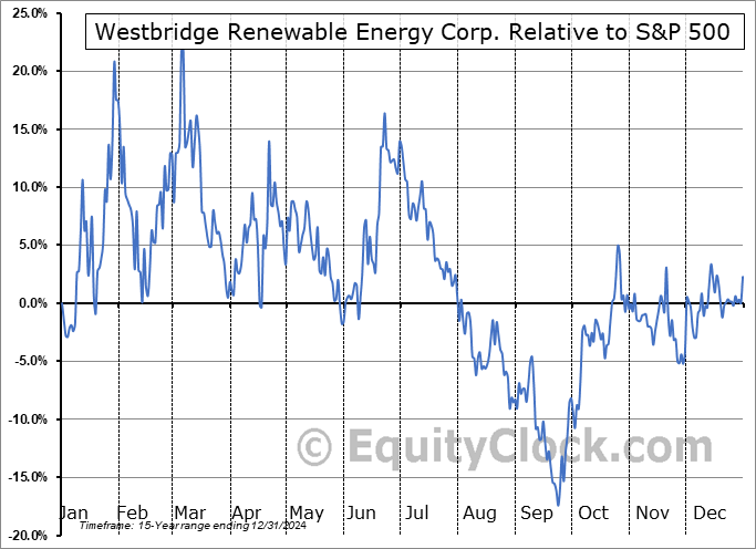 Analysis of the Westbridge Renewable Energy Corp. (TSXV:WEB.V) seasonal charts above shows that a Buy Date of November 29 and a Sell Date of March 4 has resulted in a geometric average return of 18.14% above the benchmark rate of the S&P 500 Total Return Index over the past 14 years. This seasonal timeframe has shown positive results compared to the benchmark in 11 of those periods. This is a good rate of success and the return strongly outperforms the relative buy-and-hold performance of the stock over the past 14 years by an average of 42.55% per year.