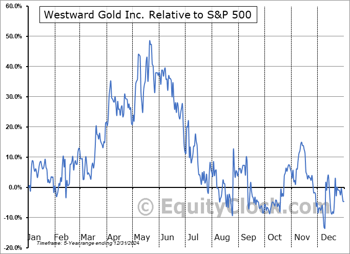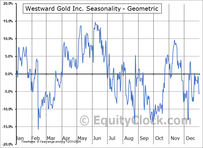Analysis of the Westward Gold Inc. (CSE:WG.CA) seasonal charts above shows that a Buy Date of February 13 and a Sell Date of May 9 has resulted in a geometric average return of 37.06% above the benchmark rate of the S&P 500 Total Return Index over the past 5 years. This seasonal timeframe has shown positive results compared to the benchmark in 5 of those periods. This is an excellent rate of success and the return strongly outperforms the relative buy-and-hold performance of the stock over the past 5 years by an average of 54.55% per year.