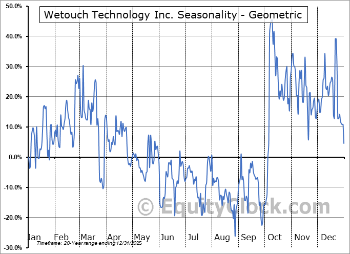 Analysis of the Wetouch Technology Inc. (NASD:WETH) seasonal charts above shows that a Buy Date of August 12 and a Sell Date of November 11 has resulted in a geometric average return of 97.88% above the benchmark rate of the S&P 500 Total Return Index over the past 20 years. This seasonal timeframe has shown positive results compared to the benchmark in 14 of those periods. This is a good rate of success and the return strongly outperforms the relative buy-and-hold performance of the stock over the past 20 years by an average of 62.79% per year.