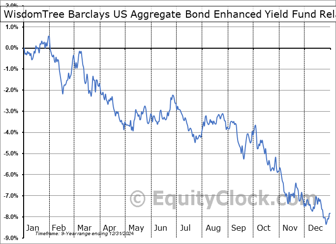 Analysis of the WisdomTree Barclays US Aggregate Bond Enhanced Yield Fund (AMEX:AGGY) seasonal charts above shows that a Buy Date of February 16 and a Sell Date of May 12 has resulted in a geometric average return of 0.46% above the benchmark rate of the S&P 500 Total Return Index over the past 9 years. This seasonal timeframe has shown positive results compared to the benchmark in 3 of those periods. This is a poor rate of success and the return strongly outperforms the relative buy-and-hold performance of the stock over the past 9 years by an average of 11.77% per year.