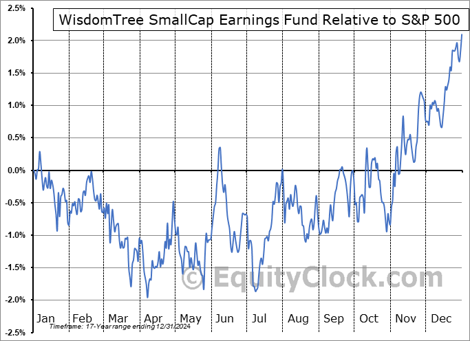 Analysis of the WisdomTree SmallCap Earnings Fund (NYSE:EES) seasonal charts above shows that a Buy Date of August 20 and a Sell Date of January 1 has resulted in a geometric average return of 2.33% above the benchmark rate of the S&P 500 Total Return Index over the past 17 years. This seasonal timeframe has shown positive results compared to the benchmark in 14 of those periods. This is a very good rate of success and the return strongly outperforms the relative buy-and-hold performance of the stock over the past 17 years by an average of 2.9% per year.