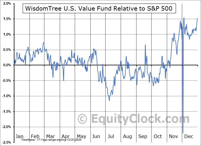 Analysis of the WisdomTree U.S. Value Fund (AMEX:WTV) seasonal charts above shows that a Buy Date of November 9 and a Sell Date of February 27 has resulted in a geometric average return of 1.05% above the benchmark rate of the S&P 500 Total Return Index over the past 17 years. This seasonal timeframe has shown positive results compared to the benchmark in 14 of those periods. This is a very good rate of success and the return strongly outperforms the relative buy-and-hold performance of the stock over the past 17 years by an average of 2.04% per year.