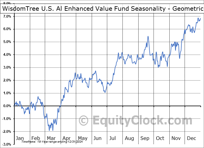 Analysis of the WisdomTree U.S. Al Enhanced Value Fund (NYSE:AIVL) seasonal charts above shows that a Buy Date of July 15 and a Sell Date of October 15 has resulted in a geometric average return of 1.18% above the benchmark rate of the S&P 500 Total Return Index over the past 18 years. This seasonal timeframe has shown positive results compared to the benchmark in 11 of those periods. This is a fair rate of success and the return strongly outperforms the relative buy-and-hold performance of the stock over the past 18 years by an average of 4.29% per year.